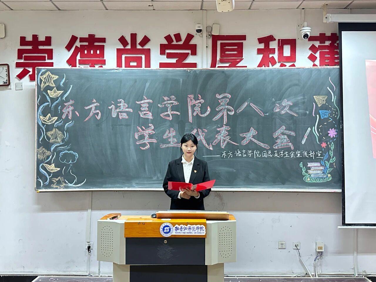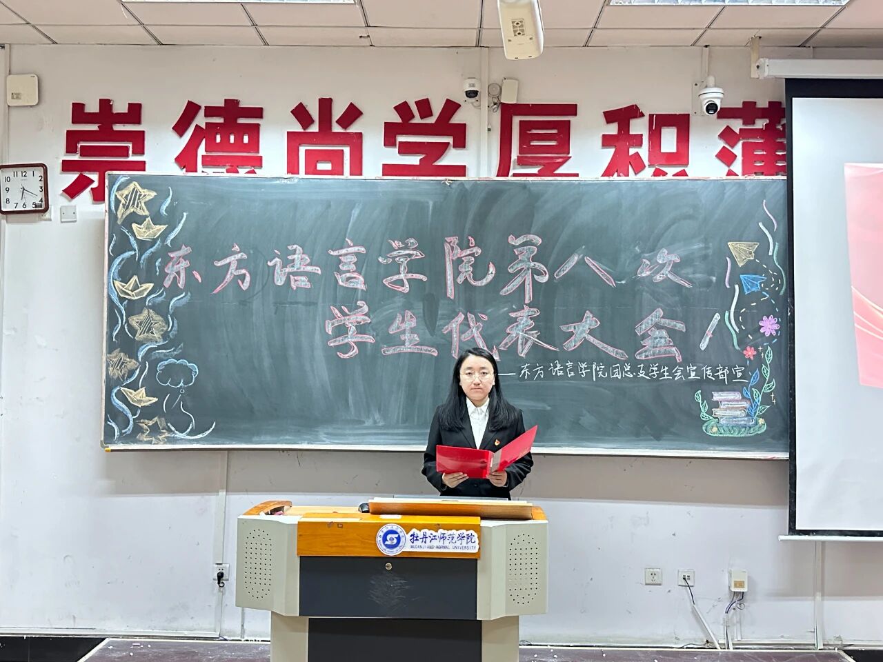 大会第四项,由东方语言学院第十八届团总支学生会主席团成员万美彤做第十八届团总支学生会工作报告。