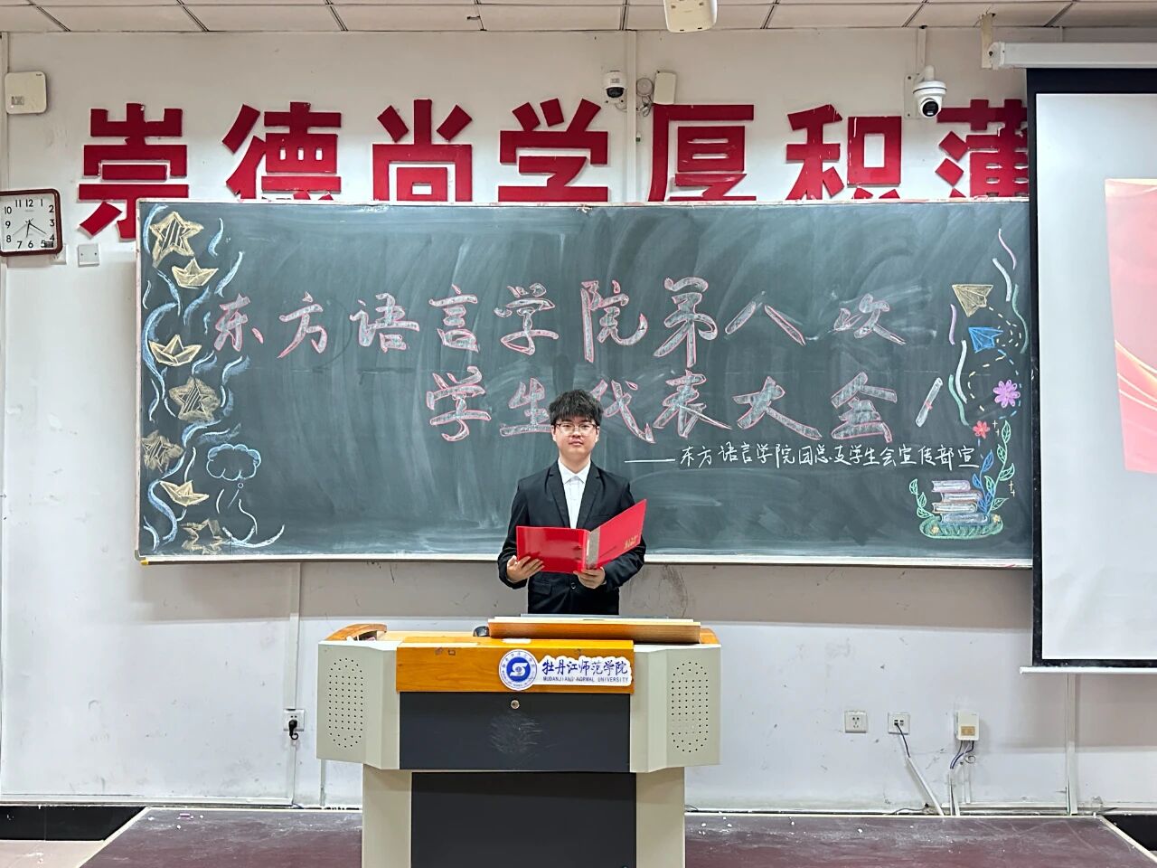 大会第十二项,由东方语言学院党委副书记张秋实致闭幕词并作总结讲话。张书记对大会的顺利召开及新一届学生委员会委员的当选表示祝贺,随后围绕学生工作对全体学生代表及新一届学生干部提出三点要求:一是坚守团结初心,以协作凝聚力量,将工作融入学院发展大局;二是注重精准沟通,既要善于倾听,吸纳合理建议,也要做好信息反馈,保障沟通畅通高效;三是做好桥梁纽带,精准传达上级决策部署,及时反映同学诉求,构建上下联动的工作闭环。