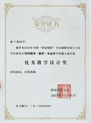 10月25日至26日,2025年全国“田家炳杯”全日制教育硕士专业学位研究生学科教学(数学)专业教学技能大赛决赛成绩出炉,我院2024级学科教学(数学)专业硕士研究生张书悦获得三等奖,张思晴、刘昕梦、樊一霖同学获得决赛优秀教学设计奖。