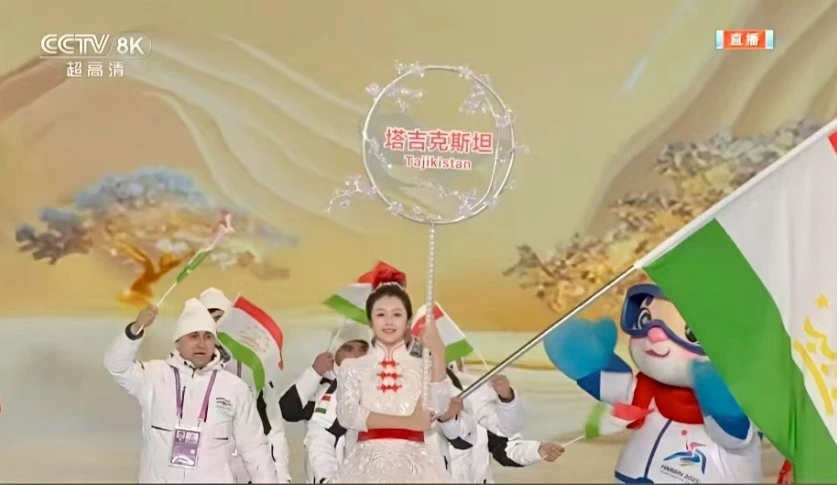 1名引导员,用微笑传递中国的温暖!经过层层选拔,我校2024级音乐与舞蹈学院舞蹈表演专业的席钰芳同学光荣地成为了亚冬会开幕式仪式塔吉克斯坦代表队的引导员。她以优雅的举止、甜美的微笑,不仅向世界展示了中国青年的自信与风采,还向塔吉克斯坦友人传递了来自东道主的热情与友好。